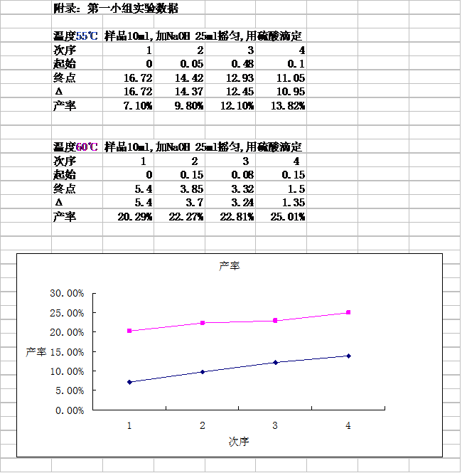 ① 稱取葡萄糖90.0g,配成葡萄糖含量為18%的葡萄糖溶液500ml;稱取NaBr13.0g,配成含NaBr2.6%的溶液 ② 溫度60℃,其它同前一次實驗 ③ 同前一次實驗 分別于11:15、12:15 、13:15、 14:15各取反應(yīng)液10ml 于錐形瓶中,各加入NaOH25ml,搖勻,用硫酸滴定 |